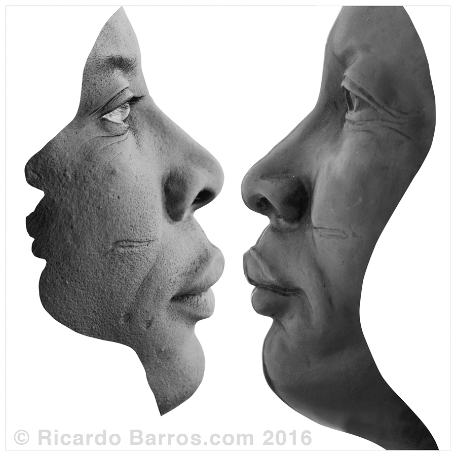 The response to a work of art can be as creative and as interpretive as the artwork itself. Such is the underlying premise of my book, “Facing Sculpture: A Portfolio of Portraits, Sculpture and Related Ideas.” This portrait arose from that premise.Joseph Acquah is a sculptor from Ghana whom I met when we both worked at a sculpture foundry in Trenton. Joseph made a remarkable self-portrait in bronze, inspiring the photograph I made and published in my 2004 book. My first portrait of Joseph, as well as its story, can be found here.During that photo session in 2000 I had a second idea for Joseph’s portrait. This second concept addressed introspection, rather than verisimilitude. Completion of the final photograph would get sidetracked for years, but my vision was clear and I collected the necessary elements at that one sitting. The portrait wasn’t actually assembled until 2009, when I was asked to provide a cover image for a literary magazine, The Trenton Review.I digitally scanned the three negatives shot years before: a silhouette of the bronze bust, a close-up of the bronze in profile, and a close-up of Joseph in profile. Using the silhouette as a delimiter, I placed Joseph’s human face into the silhouette but looking backward, peering into the back of his own head. There he encounters his likeness in bronze.The artist and his artwork are one, yet at the same time they are separate. One cannot see both the complete profile and the two faces contained therein simultaneously. For me, this portrait is more than a visual paradox. It is a metaphor for art itself.