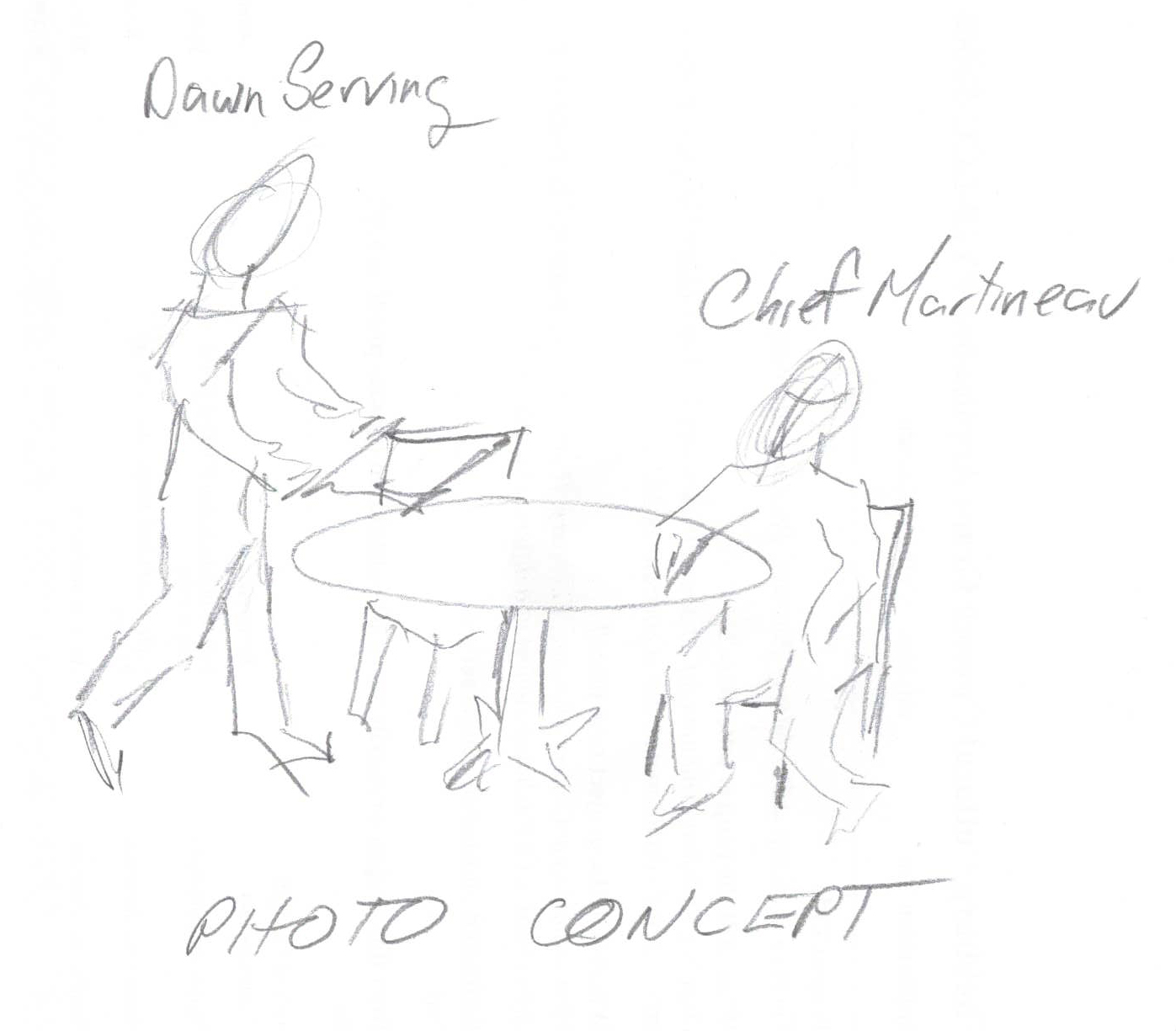 Dawn – Here is my concept motivating your portrait. We’ll photograph you interacting with Chief Martineau (whom I have not yet invited to participate) at The Pauper’s Pantry. The actual shot will be improvised on-set, but you could walk by, serve him, share a meal, or do anything that animates the setup.